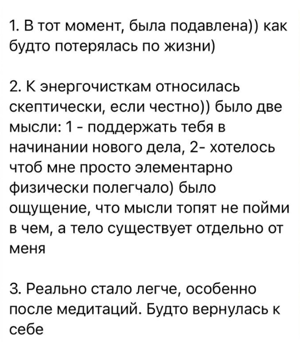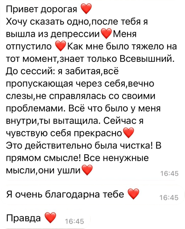 После терапии человек чувствует ясность в мыслях, теле и сердце, он убежден в своих действиях и готов меняться к лучшему.
